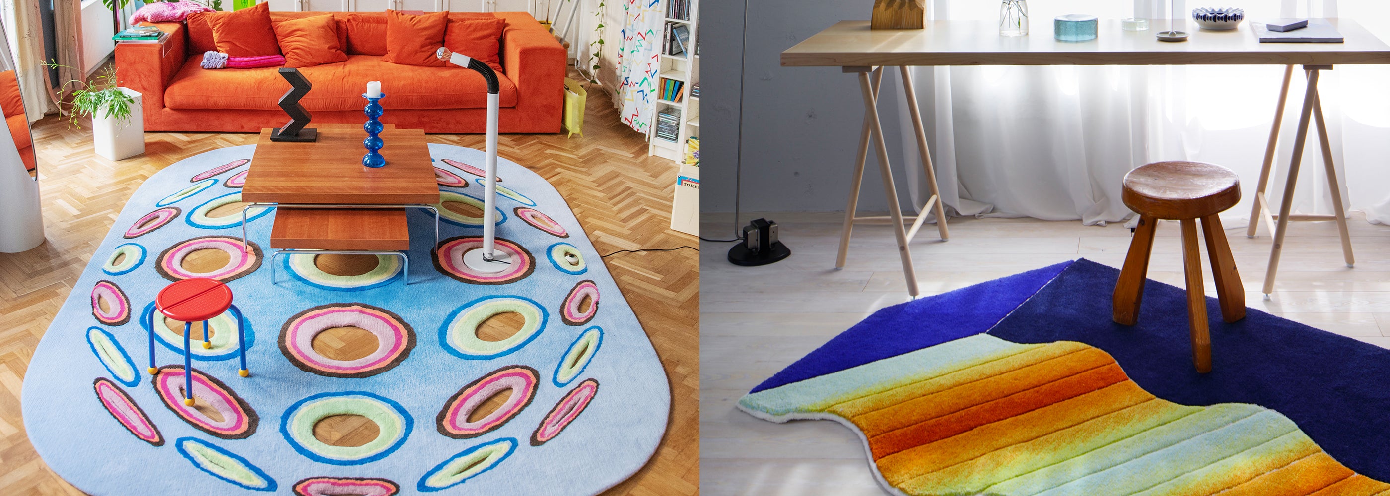 Keisuke Shoda—an inspiring art director/graphic designer whose work is seen not only in Japan but all around the world—has founded STUDIO THE BLUE BOY. Since little, he has been interested in art and expressing his creativity on canvas. The art-rugs are his drawings morphing into a real life object—They are born from the extent of his representations that render architectures, interior designs, furniture, and sceneries that he has encountered in his journeys. Shoda is deft at transforming his designs into exquisite shapes, and highly perceptive of selecting exceptional materials and defining superlative manufacturing processes. Each rug is meticulously handmade by the textile craftsman in Kyoto, and every intricate task, from dying to weaving, is done in one studio. The abstract style, texture, and pleasant feel of the rug—The wonderfully quirky shaped creation gives visual joy, and a subtle romantic escape from an ordinary life.
